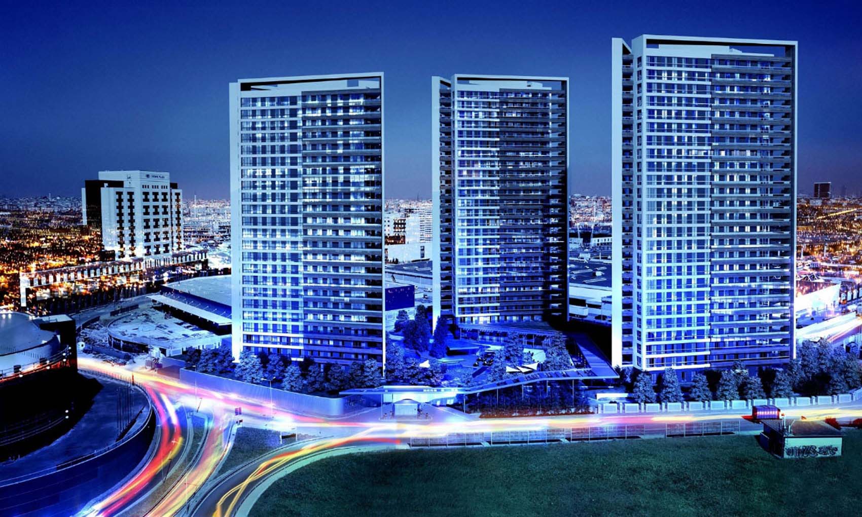 Hayat Tepe Özak GYO housing project is located in Bayrampaşa district on a parcel adjacent to settlements with intensive public use. The project area has a view of the city and the sea to the south at high elevations, the Golden Horn to the east and Galata to the east, and the historical peninsula and the Bosphorus to the southeast. For this reason, the layout and angles of the residential blocks were planned in a way that they would not interfere with the view of the other. The project, which has a form close to a right triangle, has 3 housing blocks, each of which has a triangular form, placed in 3 corners of the land. Thanks to the triangular design of the blocks, floor gardens ending with spaces were arranged at the corners, which contributed to the reduction of the mass effect of the blocks. This design decision is also supported by the horizontal bands created with the balconies that continue to the middle of the facade on each floor. It is aimed that the horizontal bands give an elegant silhouette when viewed from a distance on the Self-scale, and when approached to the blocks, they approach the human scale as much as possible thanks to their permeable structure, and a visual continuity in the landscape areas and on the pedestrian scale.